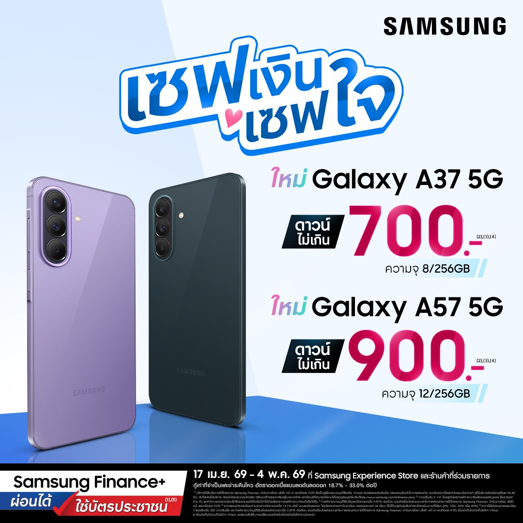 - และ Galaxy A37 (8/256) ดาวน์กับ Samsung Finance+ จ่ายไม่เกิน 700 บาท