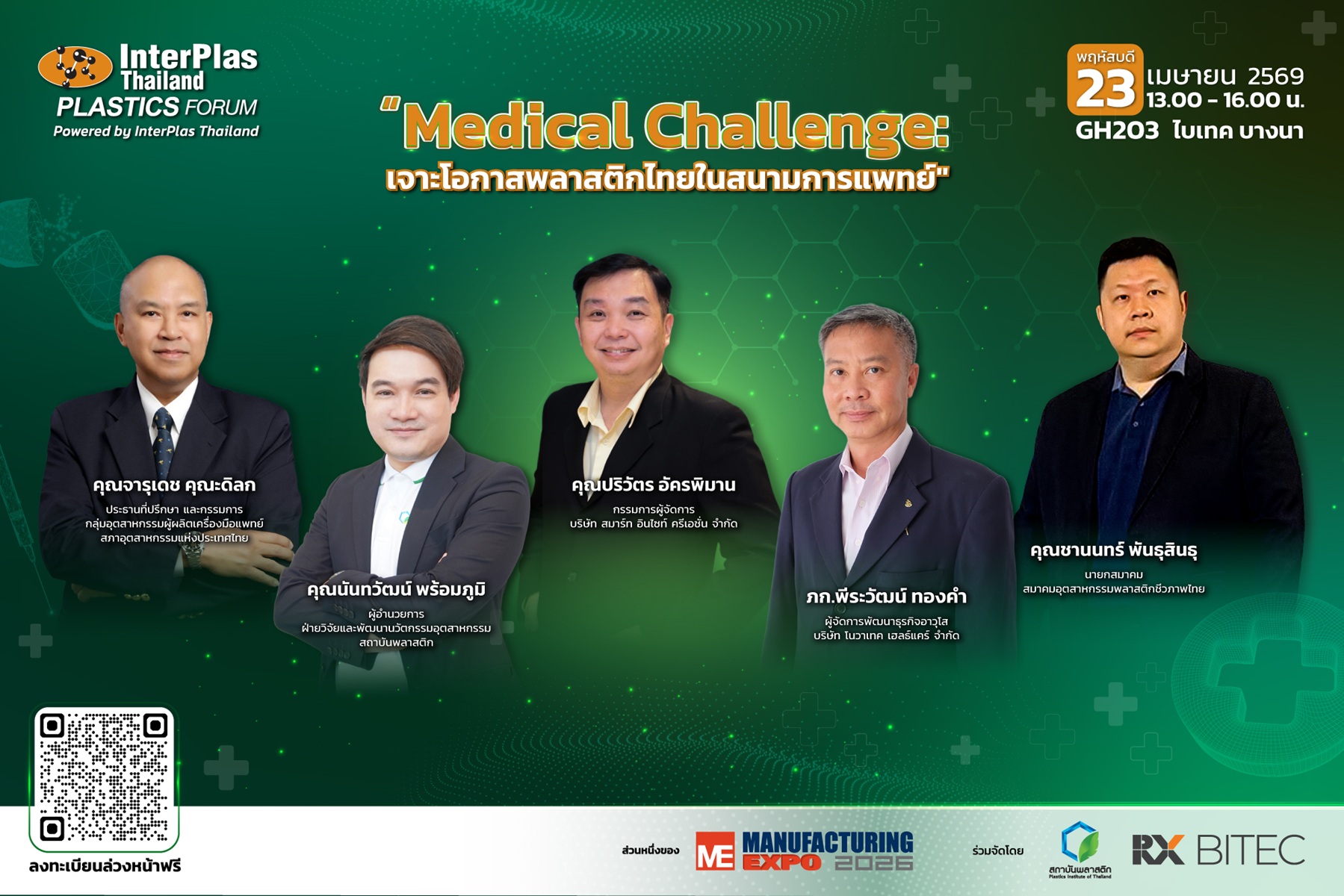 • Plastics Forum (InterPlas): “Medical Challenge: เจาะโอกาสพลาสติกไทยในสนามการแพทย์” – เมื่อพลาสติกกำลังก้าวสู่บทบาทใหม่ในโลกการแพทย์ มาร่วมกันเจาะโอกาสจริงของตลาด Medical Plastics ที่กำลังมาแรง เข้าใจมาตรฐาน ข้อกำหนดที่จำเป็นต่อการเข้าสู่อุตสาหกรรมการแพทย์ – อัปเดตเทคโนโลยีการผลิต ที่ช่วยเพิ่มมูลค่าให้สินค้า – ได้แนวทางต่อยอดธุรกิจสู่ตลาด Medical ที่จับต้องได้จริง โดยวิทยากร คุณปริวัตร อัครพิมาน (บจก.สมาร์ท อินไซท์ ครีเอชั่น) ภก.พีระวัฒน์ ทองคำ (บจก.โนวาเทค เฮลธ์แคร์) คุณจารุเดช คุณะดิลก (กลุ่มอุตสาหกรรมผู้ผลิตเครื่องมือแพทย์ สภาอุตสาหกรรมแห่งประเทศไทย) ดำเนินรายการโดย คุณชานนทร์ พันธุสินธุ (นายกสมาคมอุตสาหกรรมพลาสติกชีวภาพไทย) ห้อง Grand Hall 203 ลงทะเบียนด่วนที่ https://rebrand.ly/fb_preregpfm