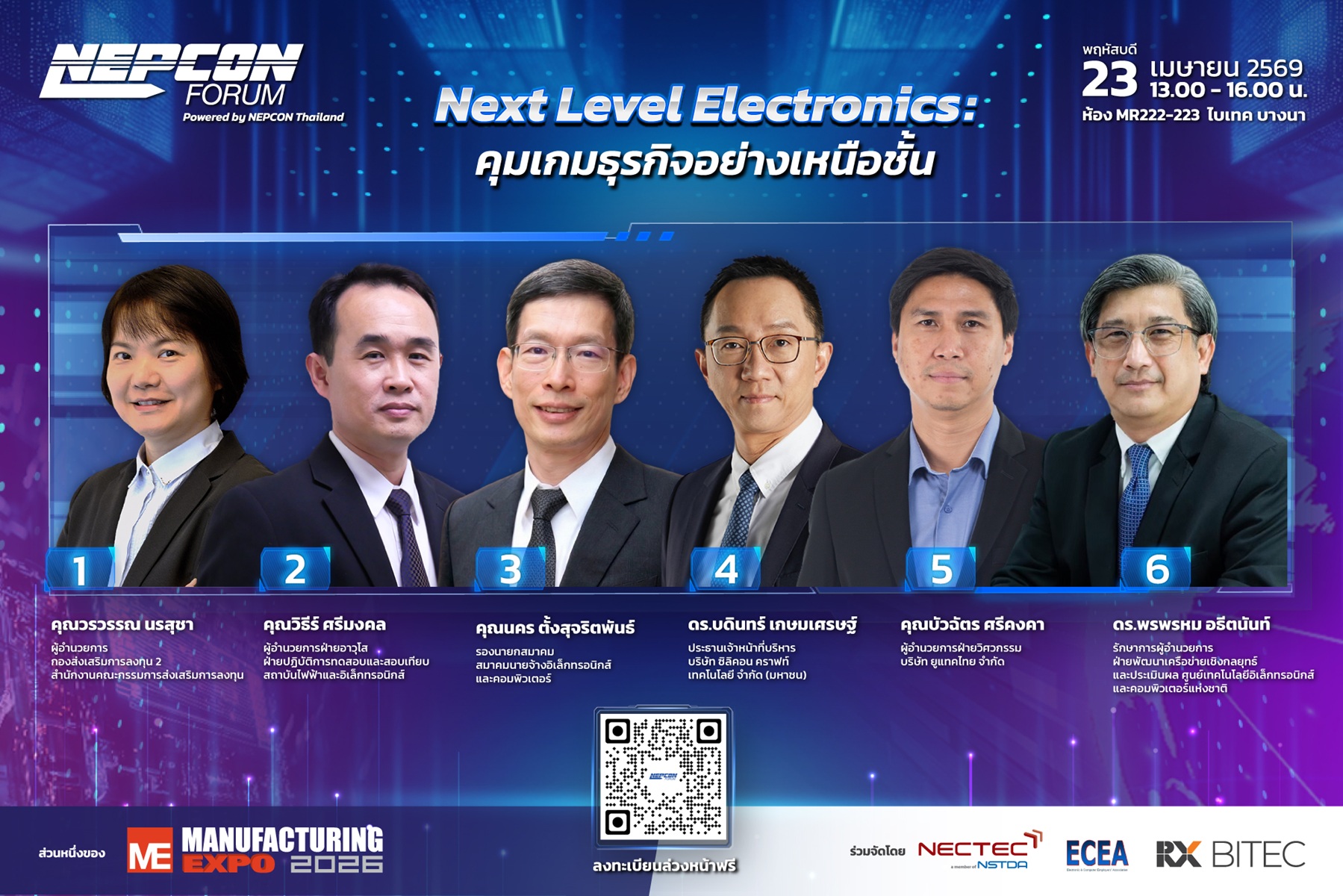 • NEPCON Forum: “Next Level Electronics: คุมเกมธุรกิจอย่างเหนือชั้น” – เพื่อรับทราบนโยบายส่งเสริมการลงทุนจากภาครัฐ และเจาะลึกภาพรวมทั้งในระดับประเทศและระดับสากล ผ่านการเสวนาระหว่างผู้บริหารหน่วยงานชั้นนำ ที่จะทำให้การเชื่อมต่อโอกาสของผู้ผลิตอิเล็กทรอนิกส์ไทยกับห่วงโซ่อุทานโลกไม่ใช่เรื่องไกลเกินเอื้อม ห้อง MR 222 – 223 สำรองที่นั่งที่ https://rebrand.ly/NEP26_fbpref